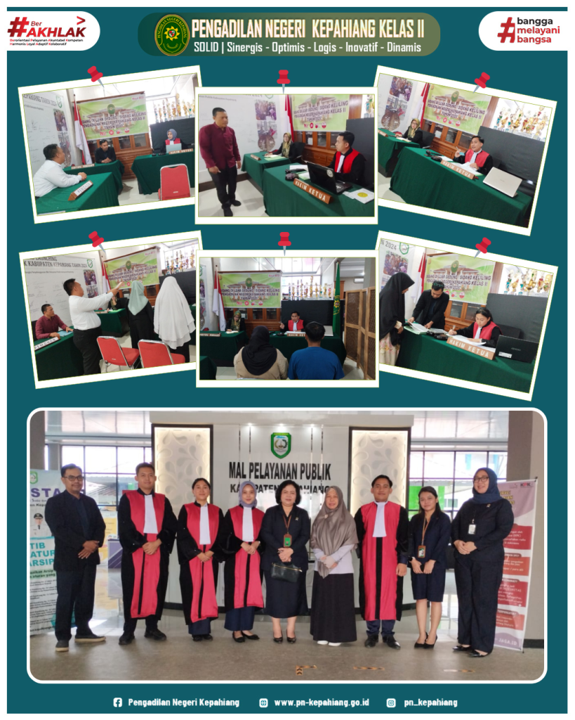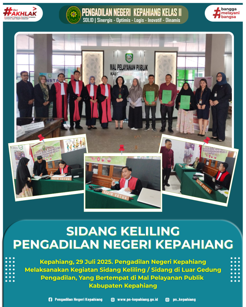 Kepahiang, 29 Juli 2025 – Pengadilan Negeri Kepahiang melaksanakan kegiatan sidang keliling bertempat di Mal Pelayanan Publik Kabupaten Kepahiang, Selasa (29/7/2025). Kegiatan ini dilaksanakan sebagai bagian dari komitmen Pengadilan Negeri Kepahiang dalam memberikan pelayanan prima kepada masyarakat, dengan menghadirkan proses peradilan yang cepat, mudah, dan biaya terjangkau.Adapun permohonan yang disidangkan dalam kegiatan ini meliputi perubahan nama dan pencatatan kematian penduduk.Sidang keliling ini menjadi lebih efektif berkat kerja sama antara Pengadilan Negeri Kepahiang dengan Dinas Kependudukan dan Pencatatan Sipil (Dukcapil) Kabupaten Kepahiang.Melalui kerja sama ini, masyarakat yang telah mendapatkan penetapan hukum dari pengadilan segera dapat melanjutkan prosesnya dan menerima dokumen kependudukan secara langsung di tempat pada hari yang sama dari Dinas dukcapil atau dikenal dengan istilah “dokumen sehari jadi”.Wakil Ketua Pengadilan Negeri Kepahiang Ibu Nunik Sri Wahyuni, S.H., M.H. menyampaikan bahwa sidang keliling ini tidak hanya bertujuan memperluas akses masyarakat terhadap layanan hukum, tetapi juga mendorong integrasi pelayanan publik lintas sektor.“Melalui sidang keliling ini, masyarakat tidak perlu lagi bolak-balik ke pengadilan dan dinas terkait. Setelah penetapan dikabulkan, dokumen dapat langsung diproses dan diterima dalam satu hari, berkat sinergi yang kami bangun bersama Dukcapil,”Dinas Dukcapil Kepahiang menambahkan bahwa pihaknya siap mendukung kegiatan seperti ini secara berkelanjutan untuk meningkatkan kepuasan masyarakat terhadap layanan administrasi kependudukan.Kegiatan ini mendapat sambutan positif dari masyarakat, terutama pemohon yang merasa sangat terbantu dengan layanan cepat dan terpadu tersebut.