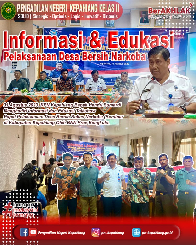 31 Agustus 2023. KPN Kepahiang Bapak Hendri Sumardi, S.H., M.H. Menghadiri Informasi dan Edukasi Talkshow Rapat Pelaksanaan Desa Bersih Bebas Narkoba (Bersinar di Kabupaten Kepahiang Oleh BNN Prov Bengkulu