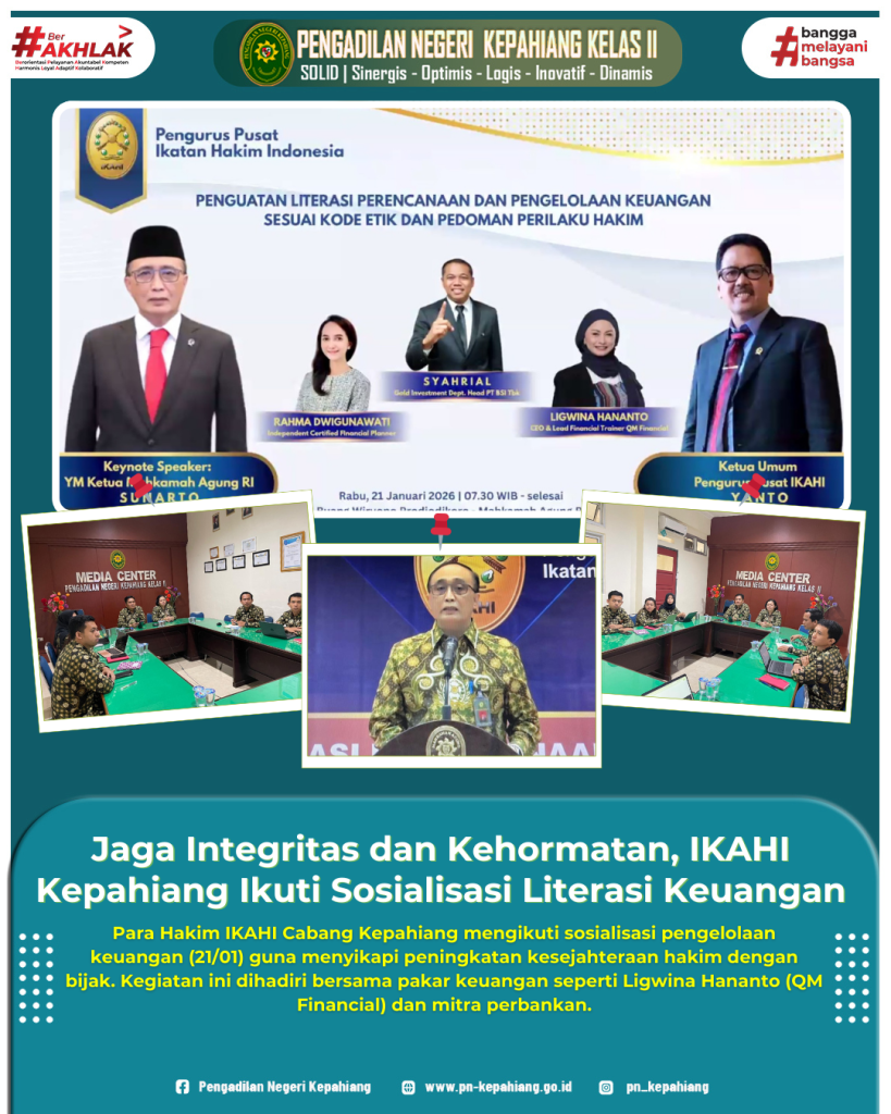Para Hakim IKAHI Cabang Kepahiang mengikuti sosialisasi pengelolaan keuangan (21/01) guna menyikapi peningkatan kesejahteraan hakim dengan bijak. Kegiatan ini dihadiri bersama pakar keuangan seperti Ligwina Hananto (QM Financial) dan mitra perbankan.