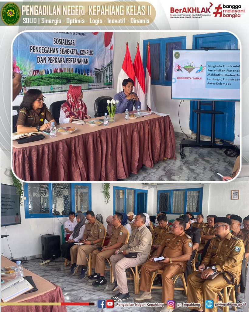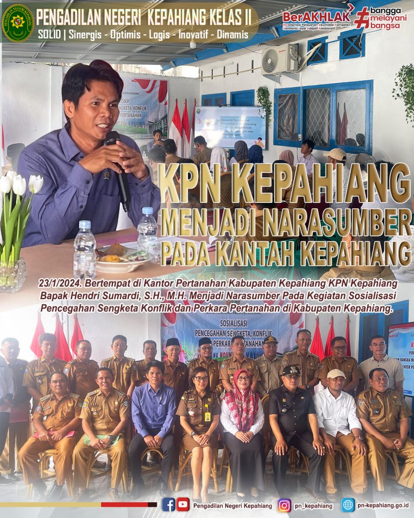 23/1/2024. Bertempat di Kantor Pertanahan Kabupaten Kepahiang KPN Kepahiang Bapak Hendri Sumardi, S.H., M.H. Menjadi Narasumber Pada Kegiatan Sosialisasi Pencegahan Sengketa Konflik dan Perkara Pertanahan di Kabupaten Kepahiang.