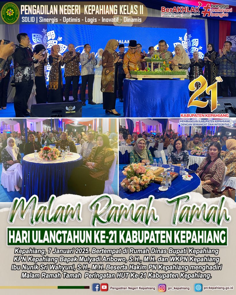 Kepahiang, 7 Januari 2025. Bertempat di Rumah Dinas Bupati Kepahiang KPN Kepahiang Bapak Mulyadi Aribowo, S.H., M.H. dan WKPN Kepahiang Ibu Nunik Sri Wahyuni, S.H., M.H. Beserta Hakim PN Kepahiang menghadiri Malam Ramah Tamah Peringatan HUT Ke-21 Kabupaten Kepahiang.