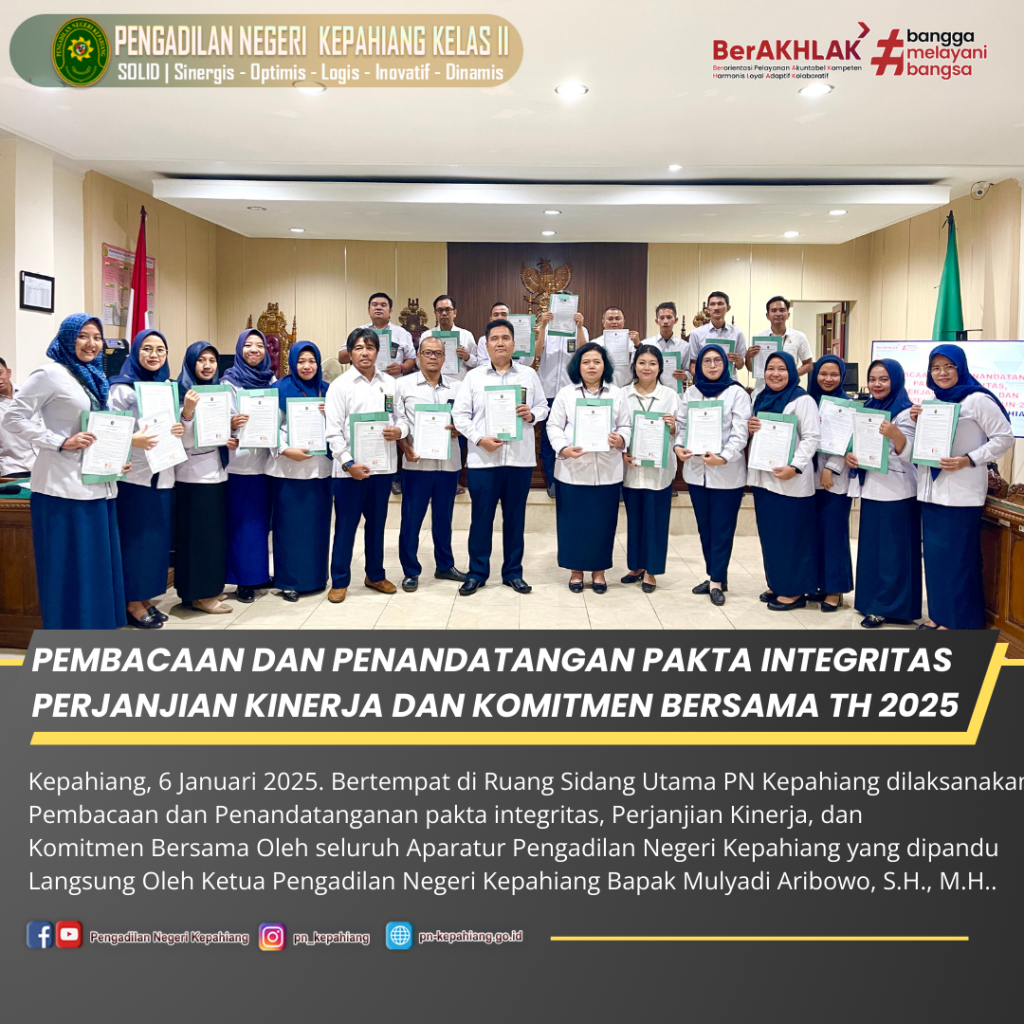 Kepahiang, 6 Januari 2025 – Bertempat di Ruang Sidang Utama Pengadilan Negeri (PN) Kepahiang, pada hari Senin, 6 Januari 2025, telah dilaksanakan acara Pembacaan dan Penandatanganan Pakta Integritas, Perjanjian Kinerja, dan Komitmen Bersama oleh seluruh aparatur Pengadilan Negeri Kepahiang. Acara ini dipandu langsung oleh Ketua Pengadilan Negeri Kepahiang, Bapak Mulyadi Aribowo, S.H., M.H.