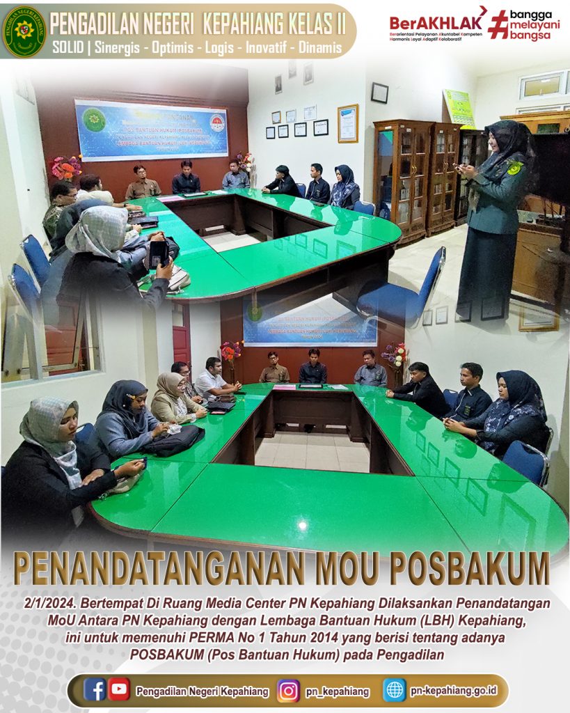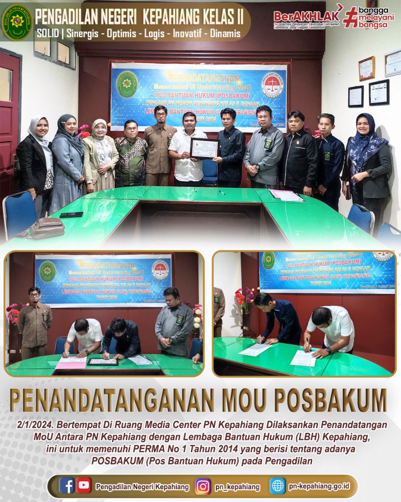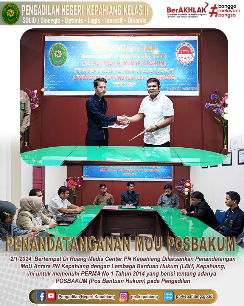 Penandatanganan MoU Lembaga Bantuan Hukum (LBH) Kepahiang dengan Pengadilan Negeri Kepahiang ini untuk memenuhi PERMA No 1 Tahun 2014 yang berisi tentang adanya POSBAKUM (Pos Bantuan Hukum) pada Pengadilan. Di dalam sambutannya, Ketua Pengadilan Negeri Kepahiang Bapak Hendri Sumardi, S.H., M.H. mengharapkan kepada Lembaga Hukum terpilih agar memberikan pelayanan kepada semua golongan tidak mampu, tanpa melihat gender dan memberikan informasi, konsultasi dan menghasilkan produk kepada pencari keadilan.
