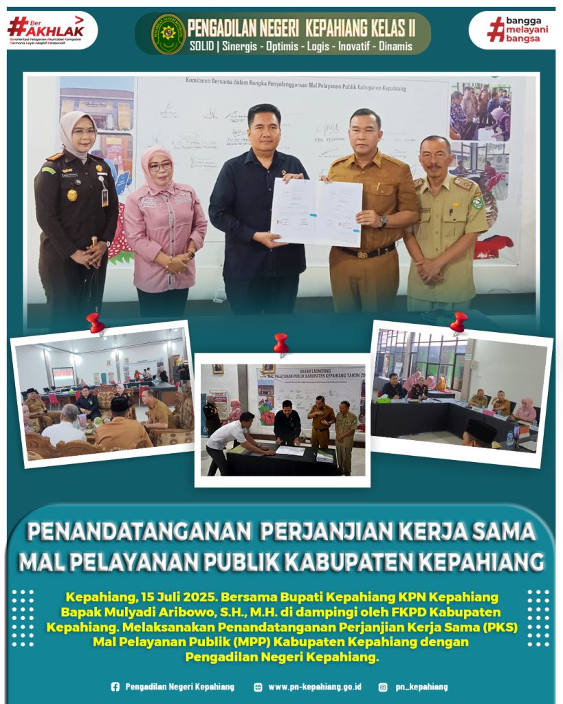 Bertempat di Mal Pelayanan Publik (MPP) Kabupaten Kepahiang telah dilaksanakan Penandatanganan Perjanjian Kerja Sama (PKS) antara Pemerintah Kabupaten Kepahiang dengan Pengadilan Negeri Kepahiang pada Selasa, 15 Juli 2025.