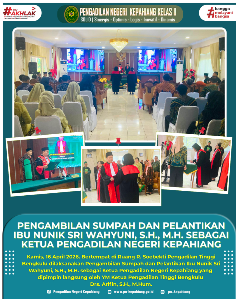Kamis, 16 April 2026 bertempat di Ruang R. Soebekti Pengadilan Tinggi Bengkulu, telah dilaksanakan acara Pengambilan Sumpah dan Pelantikan Ibu Nunik Sri Wahyuni, S.H., M.H. sebagai Ketua Pengadilan Negeri Kepahiang. Acara tersebut dipimpin langsung oleh Yang Mulia Ketua Pengadilan Tinggi Bengkulu, Drs. Arifin, S.H., M.Hum. dengan khidmat dan penuh rasa kebersamaan.