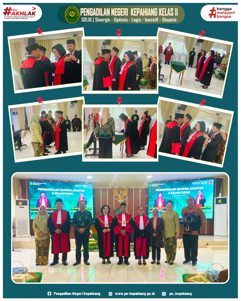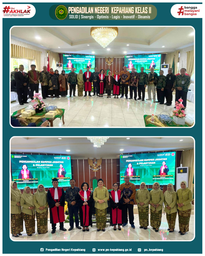 Dalam rangkaian kegiatan tersebut juga dilaksanakan Serah Terima Jabatan Ketua Pengadilan Negeri Kepahiang dari Ketua sebelumnya, Bapak Mulyadi Aribowo, S.H., M.H. kepada Ibu Nunik Sri Wahyuni, S.H., M.H. sebagai bentuk estafet kepemimpinan dalam menjaga kesinambungan pelaksanaan tugas dan pelayanan peradilan.