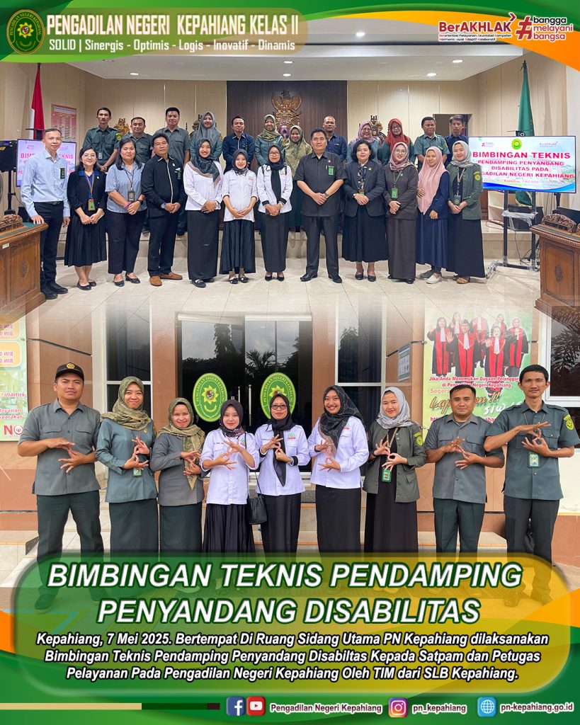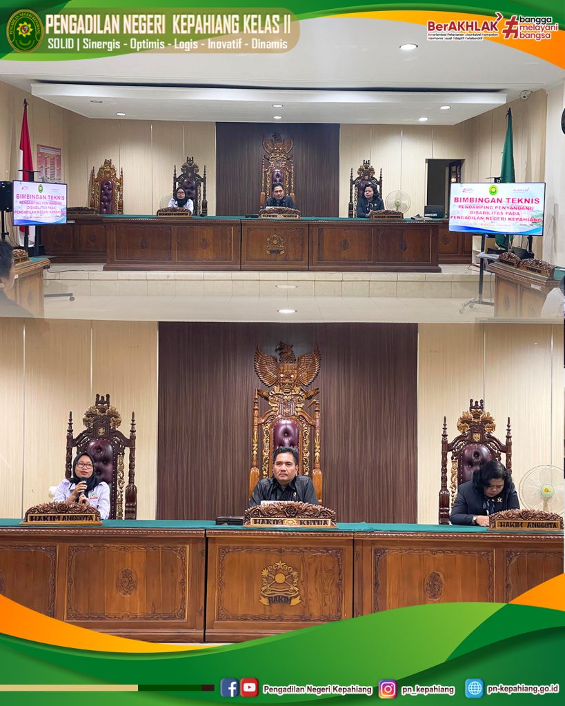 Kepahiang, 7 Mei 2025 – Dalam rangka meningkatkan pelayanan yang inklusif dan ramah disabilitas, Pengadilan Negeri Kepahiang menggelar kegiatan Bimbingan Teknis (Bimtek) Pendampingan Penyandang Disabilitas yang dilaksanakan di Ruang Sidang Utama PN Kepahiang. Kegiatan ini diikuti oleh petugas pelayanan dan satuan pengamanan (Satpam) Pengadilan Negeri Kepahiang, dengan narasumber dari Tim Sekolah Luar Biasa (SLB) Kabupaten Kepahiang.