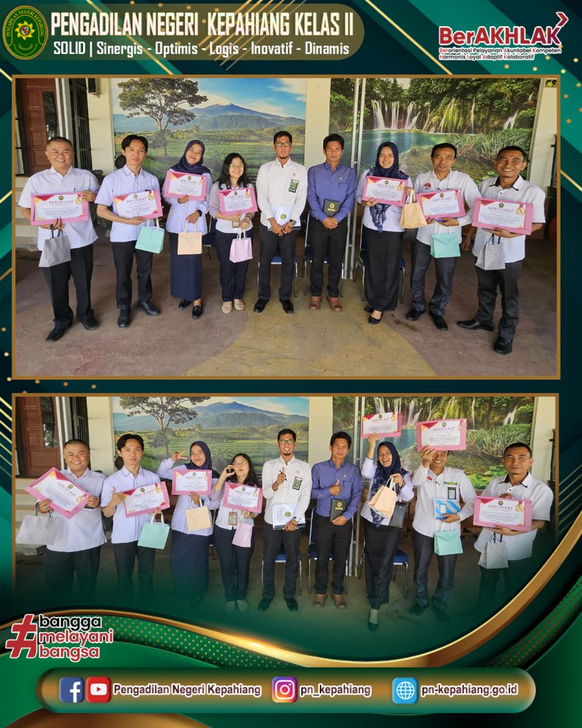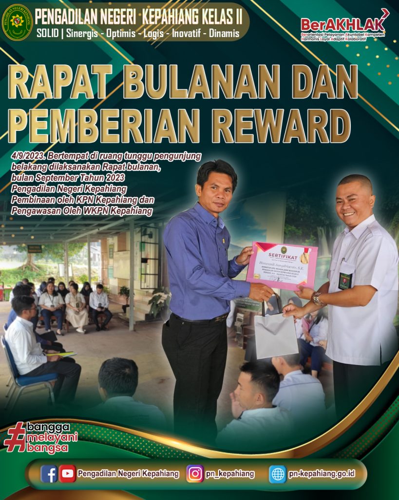 Selanjutnya sebagai bentuk apresiasi kinerja kepada Pegawai Pengdilan Negeri Kepahiang di adakan Pemberian Reward, Yakni Hakim dengan minutasi Terbaik, PP dengan Minutasi Terbaik, ASN Berkinerja, Berintegritas, Berdisiplin dan Petugas PTSP Terbaik.