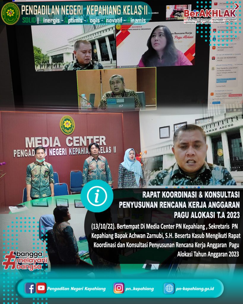 (13/10/22). Bertempat Di Media Center PN Kepahiang , Sekretaris PN Kepahiang Bapak Achwan Zarnubi, S.H. Beserta Kasub Mengikuti Rapat Koordinasi dan Konsultasi Penyusunan Rencana Kerja Anggaran Pagu Alokasi Tahun Anggaran 2023 Secara Virtual