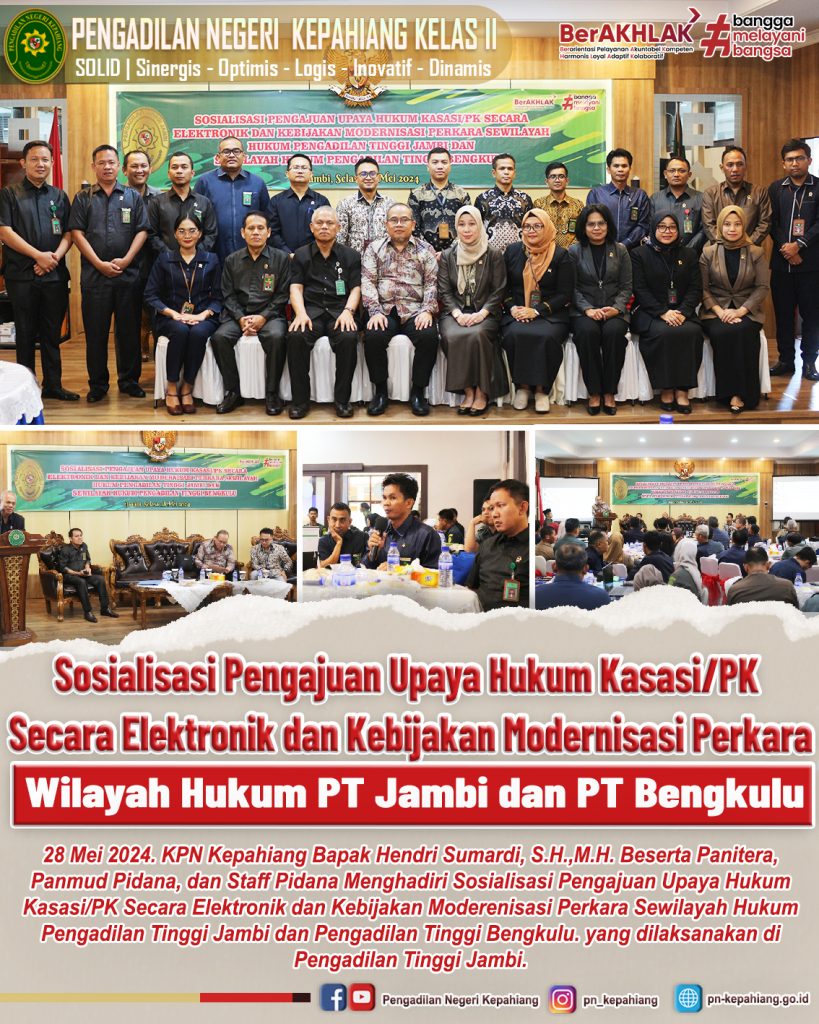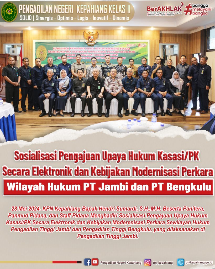 28 Mei 2024. KPN Kepahiang Bapak Hendri Sumardi, S.H.,M.H. Beserta Panitera, Panmud Pidana, dan Staff Pidana Menghadiri Sosialisasi Pengajuan Upaya Hukum Kasasi/PK Secara Elektronik dan Kebijakan Moderenisasi Perkara Sewilayah Hukum Pengadilan Tinggi Jambi dan Pengadilan Tinggi Bengkulu. yang dilaksanakan di Pengadilan Tinggi Jambi.