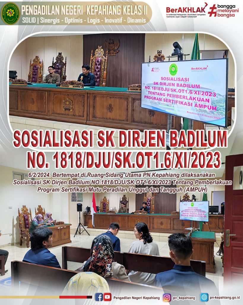 6/2/2024. Bertempat di Ruang Sidang Utama PN Kepahiang dilaksanakan Sosialisasi SK Dirjen Badilum NO.1818/DJU/SK.OT1.6/XI/2023 Tentang Pemberlakuan Program Sertifikasi Mutu Peradilan Unggul dan Tangguh (AMPUH) Pada Seluruh Aparatur PN Kepahiang.