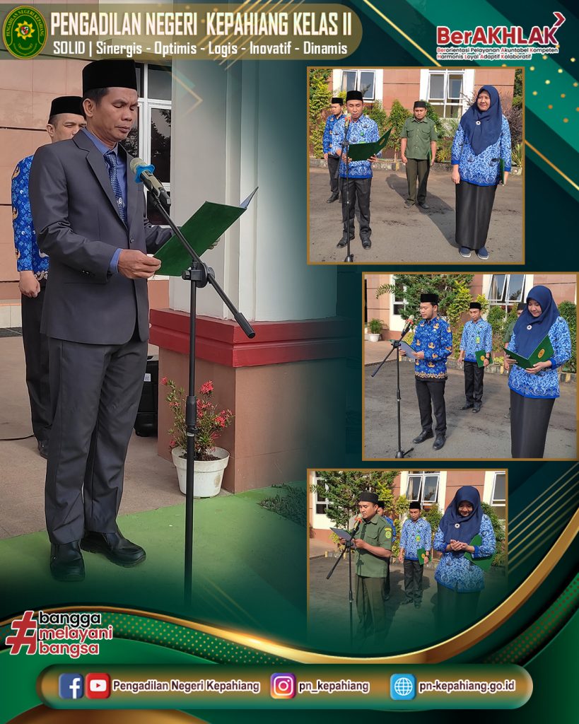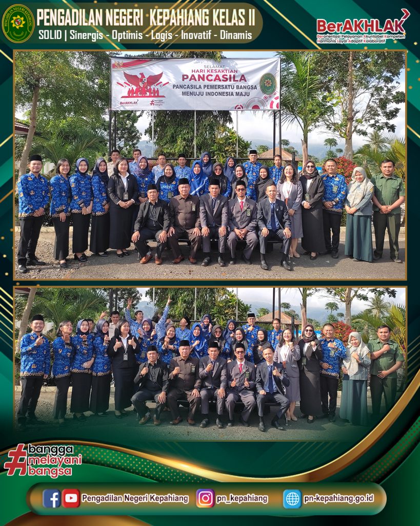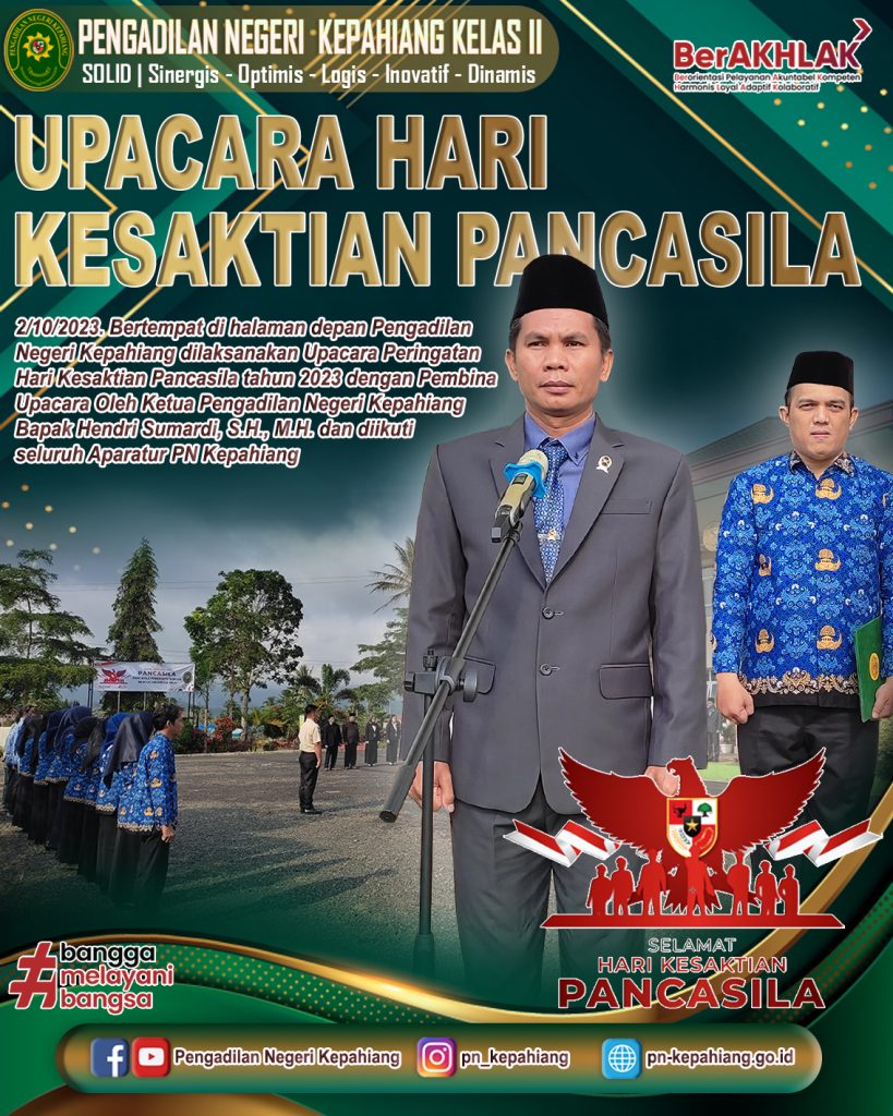 Senin tanggal 2 Oktober 2023 . Memperingati Hari Kesaktian Pancasila Pengadilan Negeri Kepahiang Melaksanakan Upacara Hari Kesaktian Pancasila bertempat di halaman depan gedung Pengadilan Negeri Kepahiang. Dengan Pembina Upacara Oleh Ketua Pengadilan Negeri Kepahiang Bapak Hendri Sumardi, S.H., M.H. dan Pemimpin Upacara Oleh Bapak Iksan Agustian, diikuti oleh WKPN Kepahiang, seluruh hakim, pejabat struktural dan fungsional serta karyawan/i Pengadilan Negeri Kepahiang. ” Pancasila Pemersatu bangsa Menuju Indonesia Maju”.