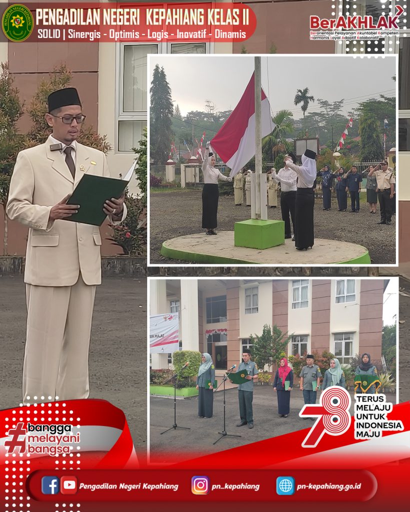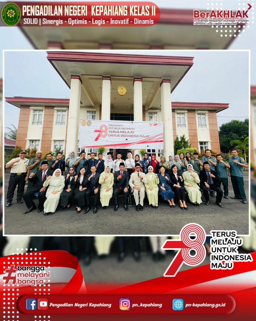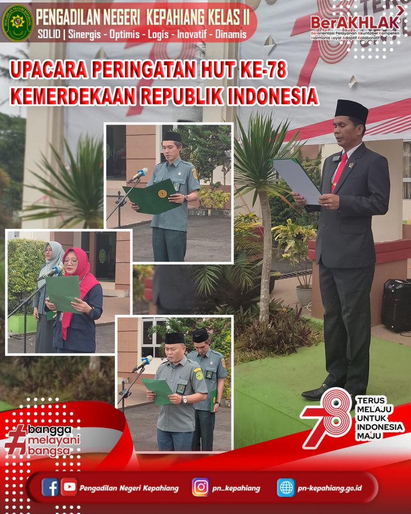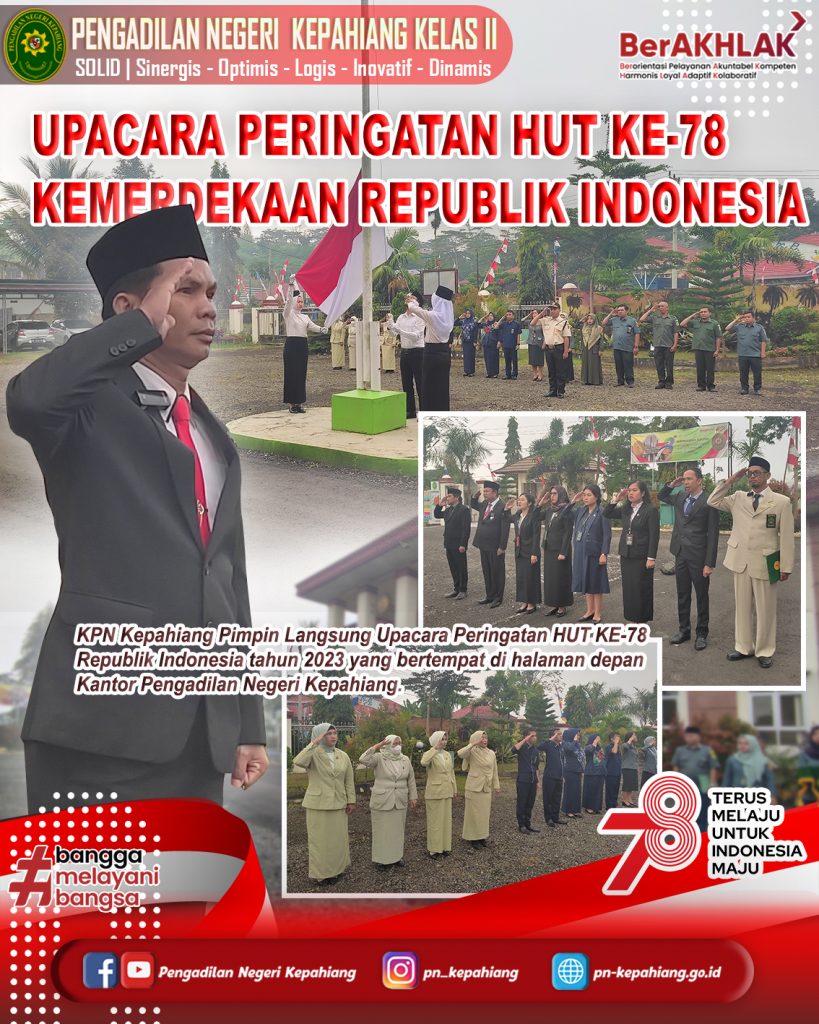 Kepahiang, 17 Agustus 2023Bertempat di halaman kantor Pengadilan Negeri Kepahiang, seluruh aparatur Pengadilan Negeri Kepahiang beserta Ibu-ibu DYK Cabang Kepahiang melaksanakan upacara memperingati hari Kemerdekaan Republik Indonesia ke-78. Upacara tersebut dipimpin langsung oleh ketua Pengadilan Negeri Kepahiang Bapak Hendri Sumardi, S.H., M.H. yang bertindak selaku inspektur upacara. Upacara berlangsung dengan khidmat dan ditutup dengan foto bersama.