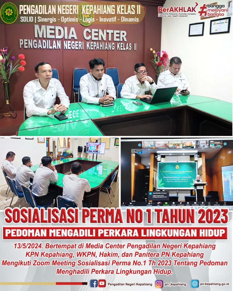 13/5/2024. Bertempat di Media Center Pengadilan Negeri Kepahiang . KPN Kepahiang, WKPN, Hakim, dan Panitera PN Kepahiang Mengikuti Zoom Meeting Sosialisasi Perma No.1 Th 2023 Tentang Pedoman Menghadili Perkara Lingkungan Hidup.