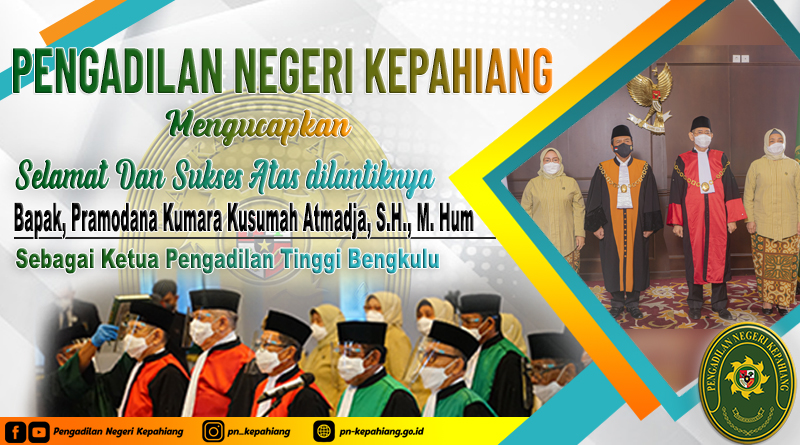 salamSOLID Keluarga Besar Pengadilan Negeri Kepahiang, Mengucapkan Selamat dan sukses, atas dilantiknya Bapak, Pramodana Kumara Kusumah Atmadja, S.H., M. Hum Sebagai Ketua Pengadilan Tinggi Bengkulu